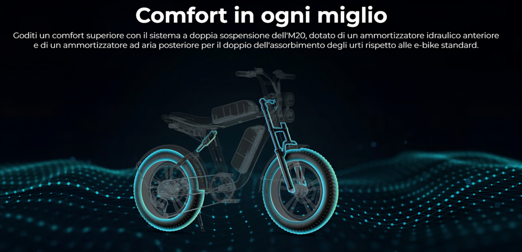 Addio all’ansia da autonomia! Questo modello con doppia batteria offre fino a 150 km di percorrenza (75 km + 75 km). Goditi un comfort superiore grazie al sistema a doppia sospensione dell’M20, con ammortizzatore idraulico anteriore e ammortizzatore ad aria posteriore per un assorbimento degli urti doppio rispetto alle e-bike standard.